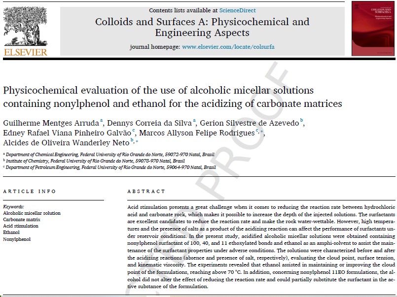 Novo artigo publicado!! Physicochemical evaluation of the use of alcoholic micellar solutions containing nonylphenol and ethanol for the acidizing of carbonate matrices (2022)